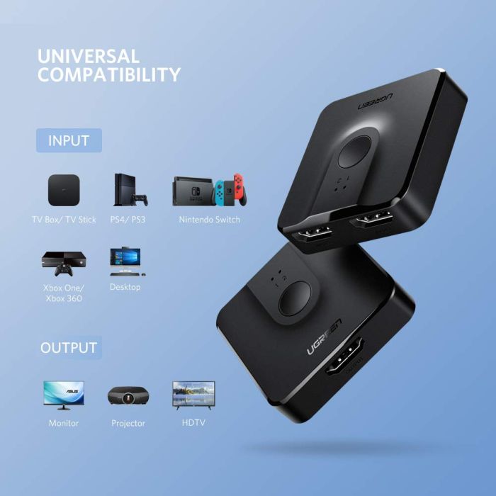 Ugreen stikalo omogoča tudi dvosmerno uporabo, tako lahko povežete dve izvorni napravi z enim monitorjem ali dva monitorja z eno napravo.