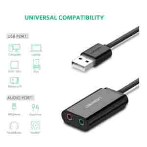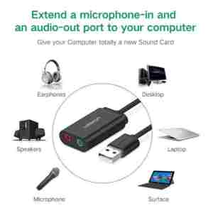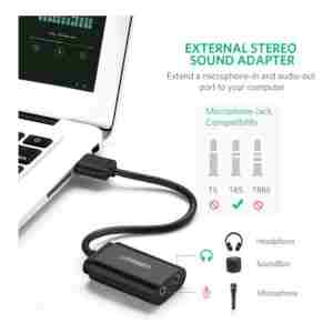 Ugreen USB Audio Adapter vključuje stereo izhod za slušalke in vhod za mono mikrofon. Lahko zaobide okvarjeno zvočno kartico ali napačna 3,5-milimetrska avdio vrata prenosnega / namiznega sistema in ponovno ustvari zvočno funkcijo za vas.