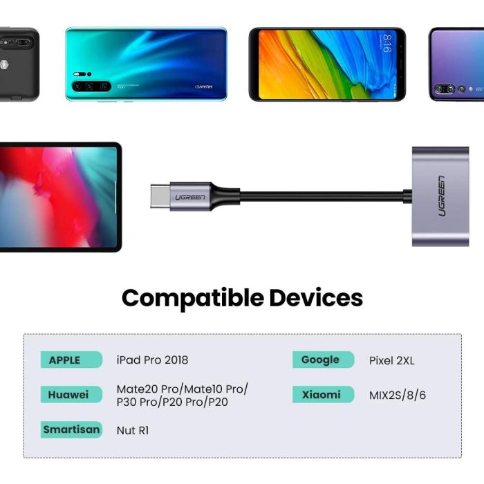 UGREEN USB-C v dvojni USB-C Adapter 2v1 podpira poslušanje glasbe in polnjenje s telefona preko usb-c vhoda hkrati. Široka združljivost: Dual USB C adapter je zasnovan za naprave USB C brez 3,5 mm vrat. Kot so Google Pixel 2XL, iPad Pro 2018, HUAWEI P20 / P20 / Mate 30 Pro, Xiaomi Mix 2S in še več. Opomba: Ne deluje za Samsung Note 10/10 +, moto serije Moto in One Plus 6T.