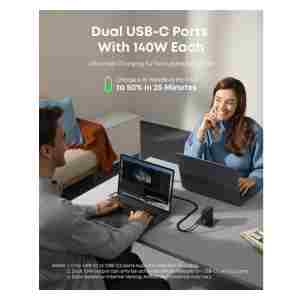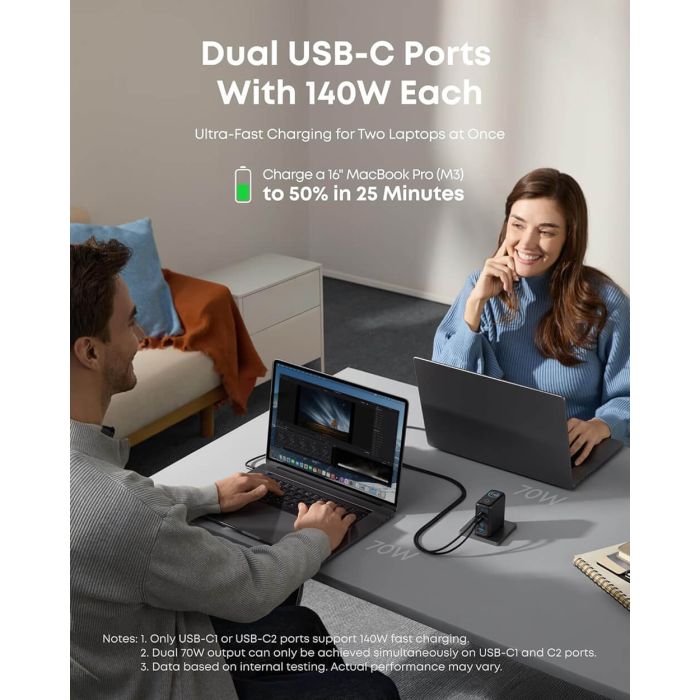 Uživajte v udobju sočasnega napajanja štirih naprav z napredno GaN tehnologijo, ki zagotavlja optimalno zmogljivost. - Dvojna visoko hitrostna USB-C priključka