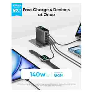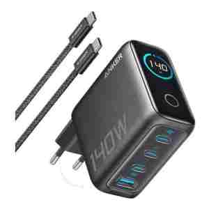 Anker polnilec (140 W, 4 priključki, PD 3.1), USB-C v USB-C kabel dolžine 1,5 m (240 W), uporabniški priročnik, 24-mesečno garancijo ter prijazno podporo za stranke.