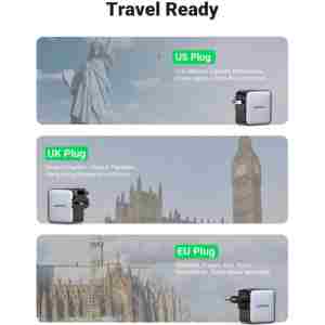 zaradi preklopnih vtičev v EU, ZDA in Združenem kraljestvu je polnilnik USB C zelo koristen in primeren za potovanja po vsem svetu ter podpira univerzalno napetost 100 V–240 V po vsem svetu.
