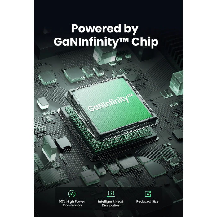 Pozdravite prihodnost polnjenja! Polnilnik UGREEN Nexode uporablja najnovejšo tehnologijo GaNInfinity, ki revolucionira način polnjenja naprav. Zahvaljujoč temu sistemu polnilec ne deluje le bolj učinkovito in uspešno, ampak je tudi bolj vzdržljiv in kompakten. Zagotavlja tudi inteligentno odvajanje toplote, ki pomaga ohranjati optimalno temperaturo med polnjenjem.