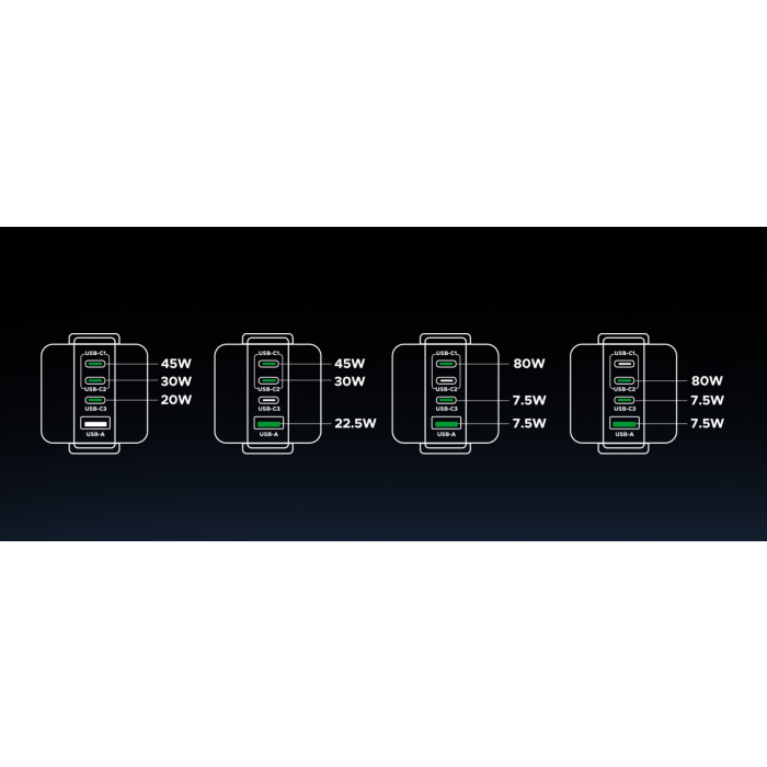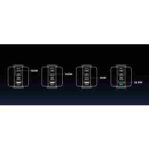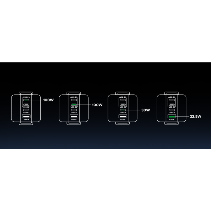 3 priključki USB-C in 1 priključki USB-A zagotavljajo do 100 W za telefone, tablice, prenosnike in drugo, vse hkrati s hitrim polnjenjem.
