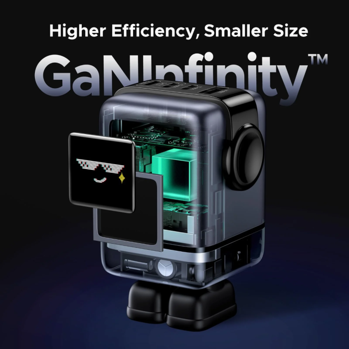 polnilnik serije UGREEN Creative, oblika robota, TFT zaslon, nadgrajen iz LED, tako da prikazuje bolj zanimive izraze glede na različno stanje polnjenja. Njegove nogice so magnetne, zato jih je mogoče pritrditi na prenosnike, ne da bi jih izgubili (Opomba: Izraz se bo prikazal le, ko je napajanje vklopljeno.)