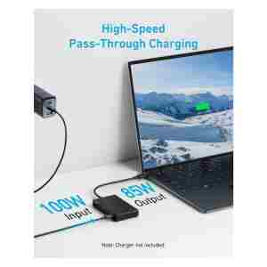 podpira do 100 W (minus 15 W za delovanje) prehodno polnjenje, tako da lahko napajate svoj prenosnik, medtem ko uporabljate hub.
