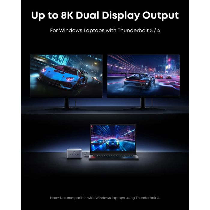 Podpira en HDMI ali DisplayPort in dva Thunderbolt 5 izhodna video priključka. Omogoča prikaz do 8K@60Hz za en sam zaslon ali dvojni 8K@60Hz prikaz za prenosnike s Thunderbolt 5 in operacijskim sistemom Windows.