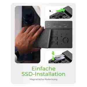 Vsebina paketa: enota, napajalnik, AC kabel, USB-C na USB-C kabel, 4× hladilna rebra, 4× termalna podloga, 6× gumijasta pritrditev