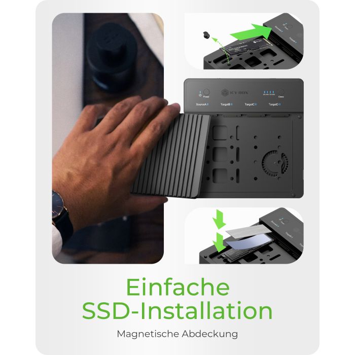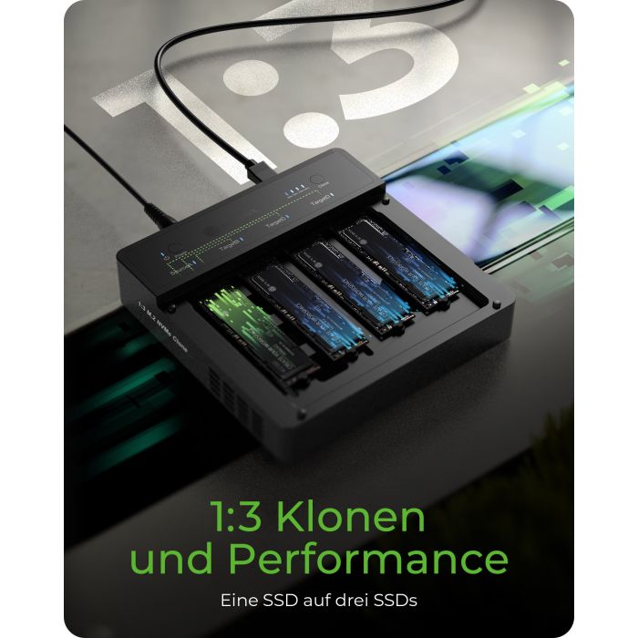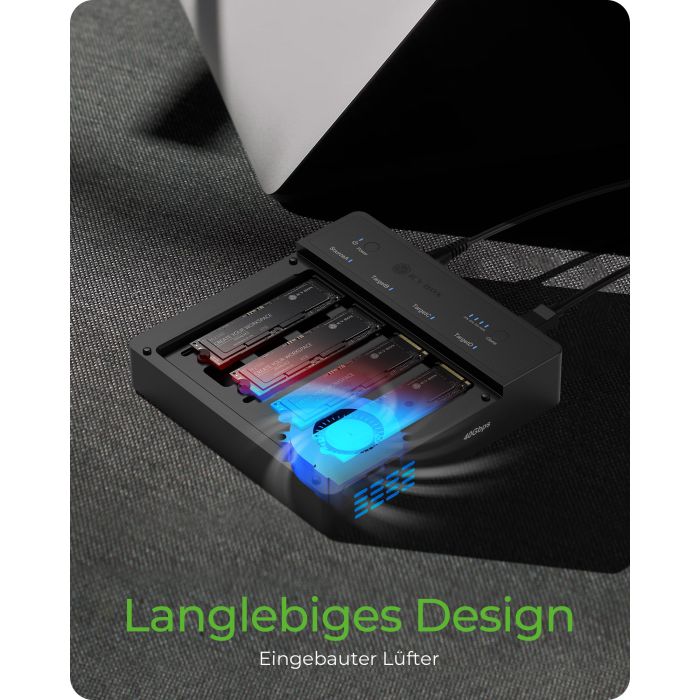 IB-4013MCL-C4 je klonirna postaja, zasnovana za hiter dostop in kloniranje do štirih M.2 NVMe SSD-jev. Podpira 1:3 offline kloniranje, visoke hitrosti prenosa do 40 Gbit/s in delovanje vsakega SSD-ja do 16 Gbit/s. Ohišje iz aluminija ter aktivno hlajenje z ventilatorjem omogočata učinkovito odvajanje toplote. Primeren je za diske velikosti 22×30/42/60/80 mm.