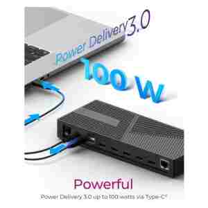 Priklopna postaja ICYBOX IB‑DK2246AC nudi obsežno podporo za povezljivost in enostaven priklop več naprav hkrati. Z naprednim DisplayLink gonilnikom omogoča hkraten priklop treh ali več monitorjev (HDMI in DP) v 4K ločljivosti pri 60 Hz. Naprava ima šest USB‑A vrat in dva USB‑C porta, dve z zmogljivostjo Power Delivery (do 100 W za host, dodatnih 30 W za periferijo), ter Gigabit Ethernet za hitra omrežna okolja. Vgrajen je celo card reader za enostavno dostopanje do pomnilniških kartic. Kompatibilno z Windows, macOS, ChromeOS in Linux. Možnost VESA montaže za čist in urejen delovni prostor.
