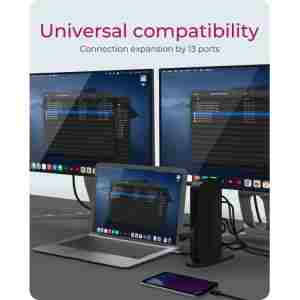 Docking postaja ICYBOX IB‑DK2252AC je vsestranska rešitev, ki vaš prenosnik ali tablico povzdigne na nivo polne delovne postaje. Poveže se prek USB–C (DisplayLink) in priključi do treh zaslonov (2× HDMI in 2× DisplayPort), omogoča priklop periferije prek šestih USB 3.0 vrat, zagotavlja stabilno omrežno povezavo prek RJ‑45 Gigabit Ethernet porta in podpira polnjenje do 65 W prek USB‑C Power Delivery. Vertikalni dizajn z robustnim stojalom prihrani prostor na mizi in omogoča naravno hlajenje. Vključuje 3,5 mm avdio priključek za slušalke/mikrofon in USB‑B posredniški vmesnik. Plug‑and‑play delovanje je podprto na Windows, macOS in ChromeOS — idealen za pisarne, domačo postavitev ali napredne IT rešitve.