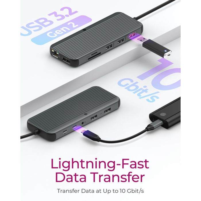 IB-DK4060-CPD je kompaktna 12-v-1 priklopna postaja z možnostjo priklopa do treh monitorjev v ločljivosti do 8K@30 Hz. USB-C povezava z DP Alt Mode omogoča hitro prenašanje podatkov do 10 Gbit/s ter napajanje naprav z močjo do 100 W. Ponuja bralnike SD/microSD 4.0, Gigabit LAN, več USB priključkov ter avdio vhod/izhod. Ohišje iz aluminija in 18-cm integriran kabel zagotavljata zanesljivo in prenosno uporabo.
