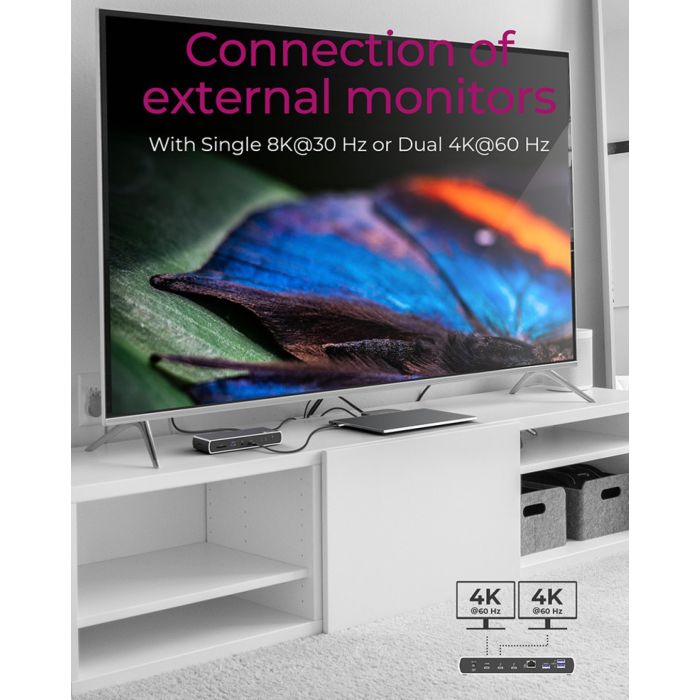IB-DK8801-TB4 je visoko zmogljiva Thunderbolt 4 priklopna postaja, zasnovana za profesionalce in zahtevne uporabnike. Ponuja hitrosti do 40 Gbit/s, podporo za en 8K zaslon ali dva 4K zaslona ter dinamični Power Delivery do 96 W. Združljiva je s Thunderbolt 4, Thunderbolt 3, USB4, DP Alt Mode in USB 2.0. Integrirana VT-d zaščita preprečuje DMA napade in zagotavlja varno delo s perifernimi napravami. Ohišje iz aluminija in pasivno hlajenje poskrbita za zanesljivo in tiho delovanje.