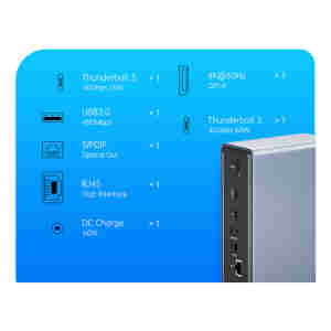 Postaja se priklopi na Thunderbolt 3 na računalniku ali prenosniku in ga razširi na 15 različnih vhodov. Omogoča enostaven priklop monitorja, USB naprav, zvočnikov, slušalk ali spominskih kartic.
