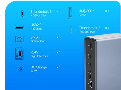 Postaja se priklopi na Thunderbolt 3 na računalniku ali prenosniku in ga razširi na 15 različnih vhodov. Omogoča enostaven priklop monitorja, USB naprav, zvočnikov, slušalk ali spominskih kartic.