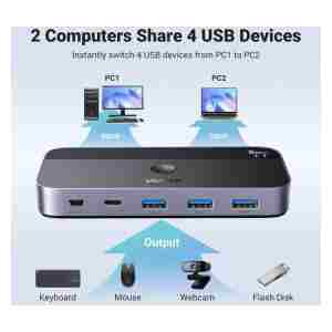 USB preklopnik UGREEN 4-In 2-Out podpira 2 računalnika, ki si delita 4 naprave USB, kot so tipkovnice, miške, tiskalniki, slušalke in kamere USB. Prosto preklapljajte med službenim in osebnim računalnikom in povečajte svojo delovno učinkovitost.