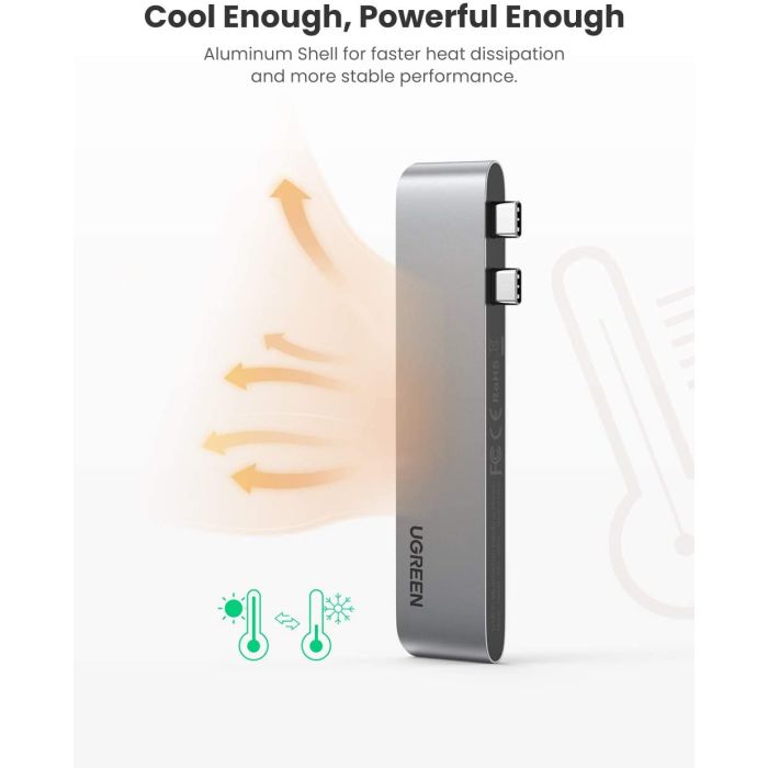 Ugreen Hub podpira PD Power USB z močjo 1000 W PD 2.0, ki omogoča hitro polnjenje prenosnega računalnika pri povezovanju z zidnim adapterjem PD. Hitro polnjenje je na voljo samo za prenosne računalnike. Za telefone podpira le običajno polnjenje.