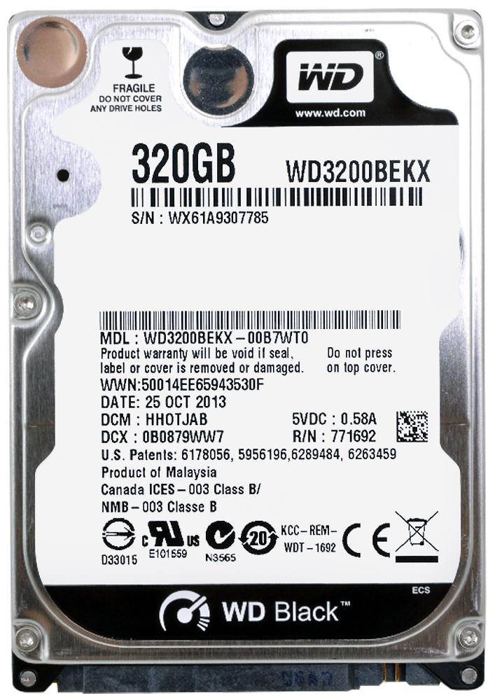 WD 2,5″ 320 GB model WD3200BEKX, 16MB, 7200 rpm.