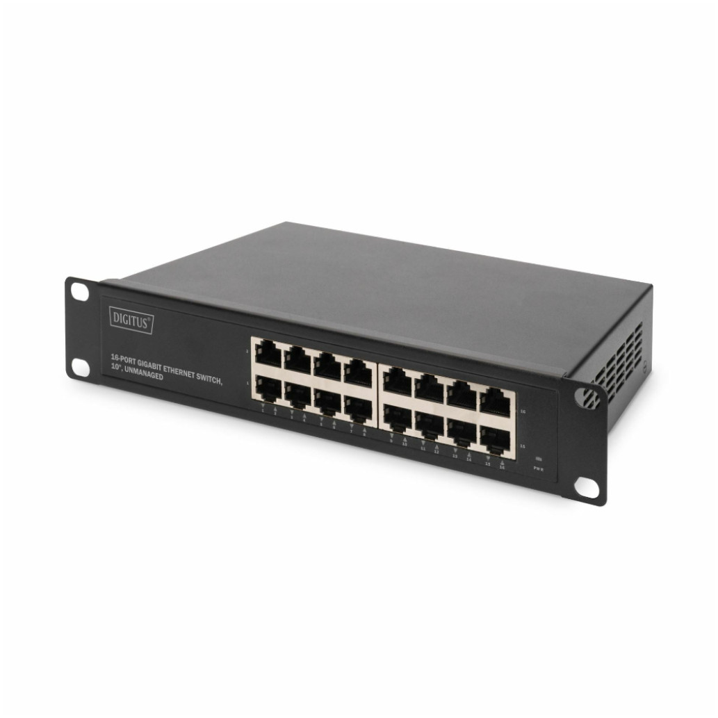 Neupravljano mrežno stikalo DIGITUS nudi šestnajst gigabitnih RJ45 priključkov. Vsi priključki podpirajo funkcijo Auto MDI/MDIX. Stikalo je zasnovano za namestitev v 10″ (25,4 cm) komunikacijsko omaro.