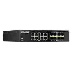 QNAP QSW-3216R-8S8T je neupravljano stikalo polovične širine za namestitev v omaro z osmimi optičnimi vrati 10GbE SFP+ in osmimi vrati 10GbE RJ45.