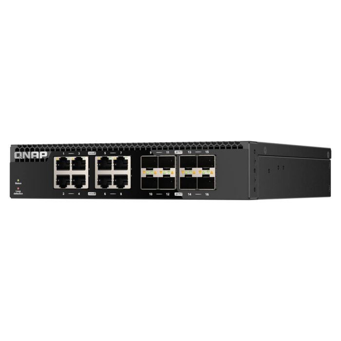 QNAP QSW-3216R-8S8T je neupravljano stikalo polovične širine za namestitev v omaro z osmimi optičnimi vrati 10GbE SFP+ in osmimi vrati 10GbE RJ45.