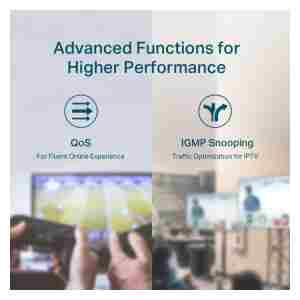 Funkcije: Združljiv z napravami PD, ki ustrezajo standardu IEEE 802.3af/at, Gumb za Extend način (priključki 1–4, do 250 m napajanja PoE in prenosa podatkov), Gumb za Priority način (priključki 1–4), Gumb za Isolation način (priključki 1–7 / 8–14), Samodejno PoE obnavljanje (priključki 1–16), Samodejno učenje in staranje MAC naslovov, Nadzor pretoka IEEE 802.3x, 802.1p/DSCP QoS, IGMP Snooping