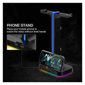 Podnožje stojala za slušalke je zasnovano z mini rezino za držanje telefona, bok stojala pa ima nameščene kavlje za razporejanje kablov, ki preprečujejo zapletanje žic in kablov.