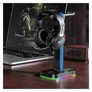 Stojalo za slušalke HAVIT TH650 RGB je zasnovano tako, da nanj lahko namestite dvoje slušalke.