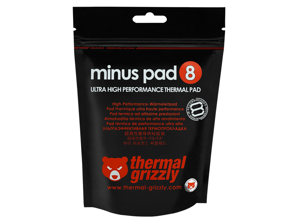Toplotno prevodne blazinice Minus Pad 8 imajo elastično in prilagodljivo površino. Zelo dobro izravnajo višinske razlike med komponentami. Dosegajo električno izolativnost 8KV/mm, V-0 stopnjo gorljivosti, Shore 00-60 trdote ter so primerne za temperature od -100°C do +250°C.