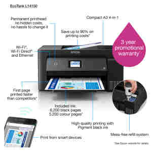 Iščete kompakt, ekonomicen in barvni tiskalnik, ki prinaša A3 odtise? L14150 kaže, da je mogoče. Ta EcoTank ponuja A4 tiskanje, skeniranje, kopiranje in faks, plus možnost tiskanja A3 iz vira zadnjih medijev – vse z izjemno nizkimi stroški na stran.