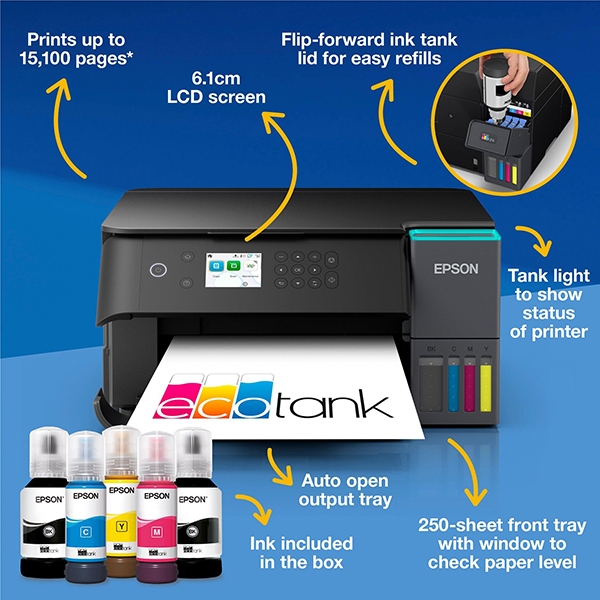 Z napredno povezljivostjo, vključno z brezžičnim tiskom in mobilnimi rešitvami, se EcoTank L6360 brez težav vključi v sodobna delovna okolja. Samodejni podajalnik dokumentov, podpora za obojestransko tiskanje ter intuitivno upravljanje omogočajo učinkovito delo in večjo produktivnost. Epson EcoTank L6360 predstavlja dolgoročno in stroškovno učinkovito rešitev za podjetja, ki potrebujejo zanesljivo večnamensko tiskalniško napravo.