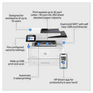 Tehnologija tiskanja: laserski ČB Maksimalna dimenzija tiskanja: A4 Namembnost: poslovna uporaba Hitrost tiskanja: do 40 str/min Povezljivost tiskalnika: USB, Mreža, WiFI Samodejno obojestransko tiskanje: da Ločljivost tiskanja: do 1200 x 1200 Največji priporočen obseg tiskanja: do 80.000 strani / mesec Možnost faksiranja: da Samodejni podajalnik dokumentov: da Obojestransko skeniranje: da Standardna kapaciteta papirja: 1×250 listov, 100 listov večnamenski pladenj Priložena črnila: začetni toner črni Dimenzije (Š x V x G): 420 x 323 x 390 mm Š x V x G Teža: 12,6 kg Dodatne informacije: / Garancija v mesecih: 12