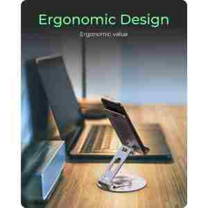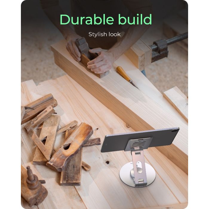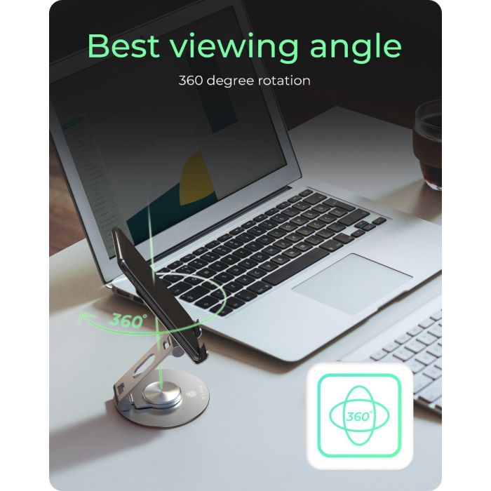 Nosilec ICYBOX IB‑TH201‑R združuje vrhunsko izdelavo in uporabnost. Omogoča popolno 360° obračanje nameščene naprave. Prilagodljiv panel drži napravo do velikosti 12,9″ in skrbi za stabilnost. Narejen je iz mešanice aluminija, robustnega jekla in silikonskih blazinic, ki preprečujejo drsenje ali praske. Nosilec je lahek in kompakten za prenašanje – primeren za uporabo doma, v pisarni ali na poti. Svoje mesto najde pri uporabnikih, ki uporabljajo tablice ali telefone za delo, gledanje vsebin ali video komunikacijo.