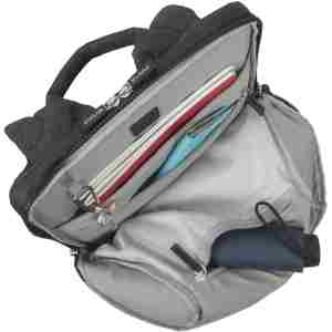 • Prostor za prenosnike z vodoodporno zadrgo, oblazinjenimi stranicami in žepom za tablico do 10 je v notranjosti dodatno zaščiten z oblazinjenim vložkom na dnu.