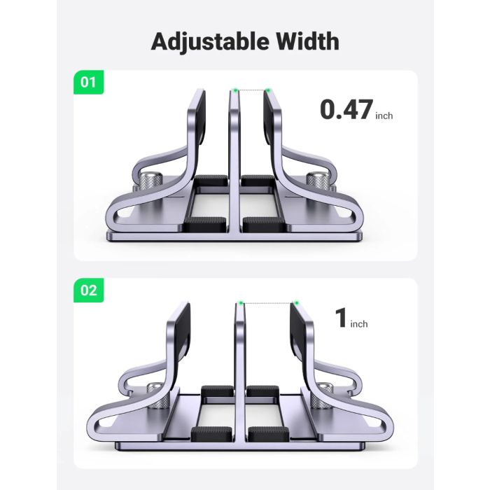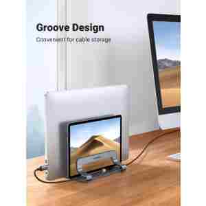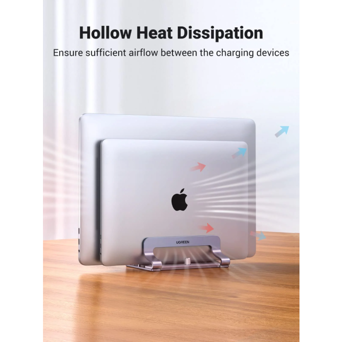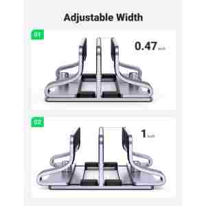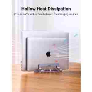 Navpično stojalo za prenosnik UGREEN drži vaš prenosnik, ko je priključen na monitor ali preprosto za shranjevanje. S posodobljeno različico priklopne postaje to dvojno stojalo za prenosnik hkrati drži dva prenosnika v pokončnem položaju, da optimizira in organizira prostor na vaši namizji.