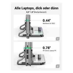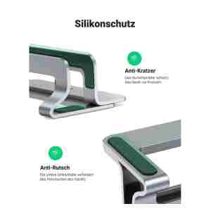 Stojalo je izdelano iz visokokakovostne aluminijeve zlitine. Trdno podnožje omogoča stabilnost stojala. Gumirana podlaga držala omogoča, da elektronske naprave v držalu trdno in stabilno stojijo na mizi in se ne majejo. Širina se nastavlja z vrtljivim gumbom in ni nevarnosti, da bi se elektronska naprava prevrnila.