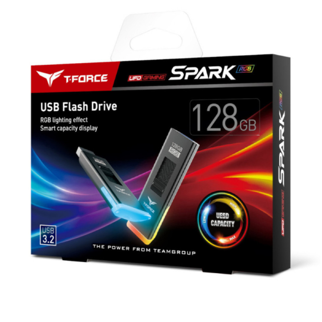 Team Group Spark RGB. Kapaciteta: 128 GB Vmesnik naprave: USB Type-A Različica USB: 3.2 Gen 1 (3.1 Gen 1) Hitrost branja: 180 MB/s Hitrost pisanja: 90 MB/s Faktor oblike: Dia. Teža: 25 g Barva izdelka: Črna
