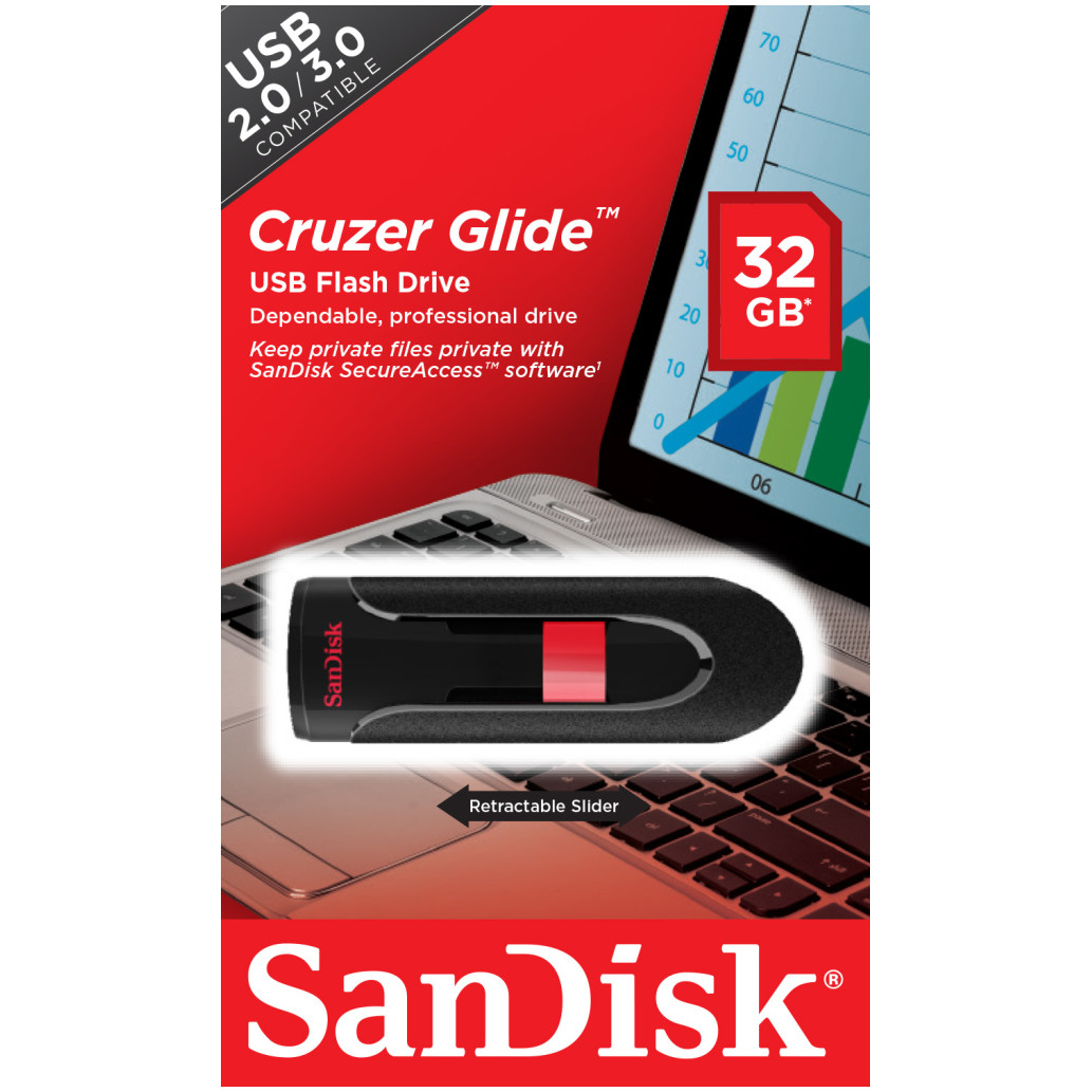Cruzer Glide USB Flash Drive ponuja eleganten, poenostavljen dizajn s privlačno črno-rdečo barvno shemo. Zaradi svoje kompaktne velikosti se zlahka spravi v žep ali torbico. Priključek za pogon USB se umakne z enim pritiskom drsnika, da zaščiti pogon, ko ni v uporabi.