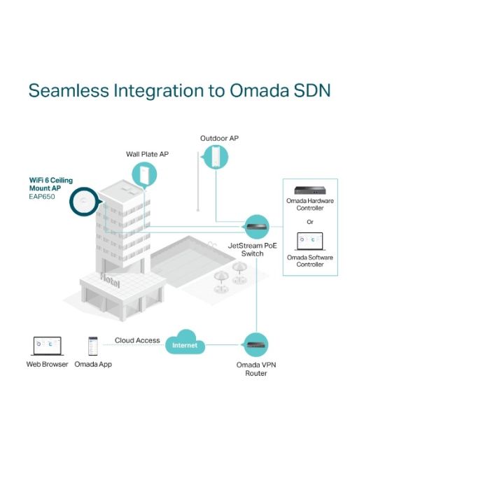 Centralizirano upravljanje v oblaku: Integracija Omada SDN upravlja celotno omrežje lokalno ali iz oblaka prek spletnega uporabniškega vmesnika ali aplikacije Omada.