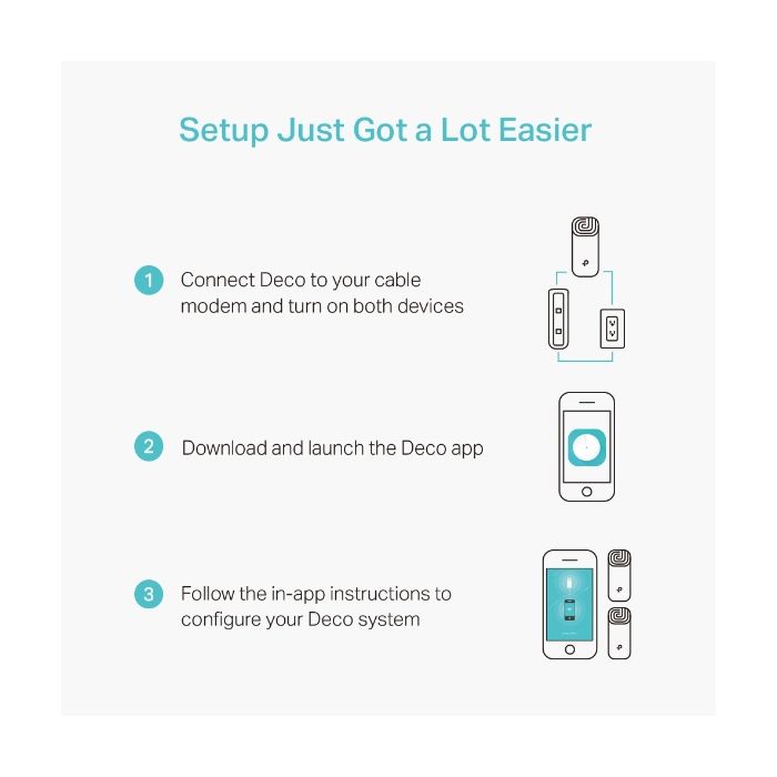 | Package Contents | ● Deco M4 (3-pack): 3 Deco units 1 RJ45 Ethernet Cable 3 power adapters 1 quick installation guide ● Deco M4 (2-pack): ● Deco M4 (1-pack): |