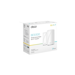 Deco BE65 (2-pack) je tri-pasovni Wi-Fi 7 mesh sistem, zasnovan za visoko zmogljivost in razširjeno pokritost v celotnem domu. Sistem uporablja najnovejši standard Wi-Fi 7 in podpira hitrosti do 5765 Mbps v 6 GHz pasu, 2882 Mbps v 5 GHz pasu ter 688 Mbps v 2,4 GHz pasu. Integrirane štiri notranje visokozmogljive antene ter uporaba TP-Link Mesh tehnologije omogočajo stabilno in neprekinjeno pokritost z možnostjo žične Ethernet backhaul povezave med vozlišči.