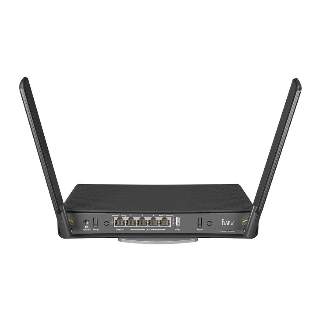 Mikrotik hAP ac³. Vrsta povezave WAN: RJ-45. Pas WLAN: dvopasovni (2,4 GHz / 5 GHz), vrhunski standard WLAN: Wi-Fi 5 (802.11ac), hitrost prenosa podatkov WLAN (maks.): 867 Mbit / s. Tip vmesnika Ethernet LAN: Gigabit Ethernet, Ethernet LAN hitrosti prenosa podatkov: 1000 Mbit/s, omrežni standard: IEEE 802.11a, IEEE 802.11ac, IEEE 802.11b, IEEE 802.11g, IEEE 802.11n. Generacija mobilnega omrežja: 4G. Vrsta izdelka: Namizni usmerjevalnik, Barva izdelka: Črna