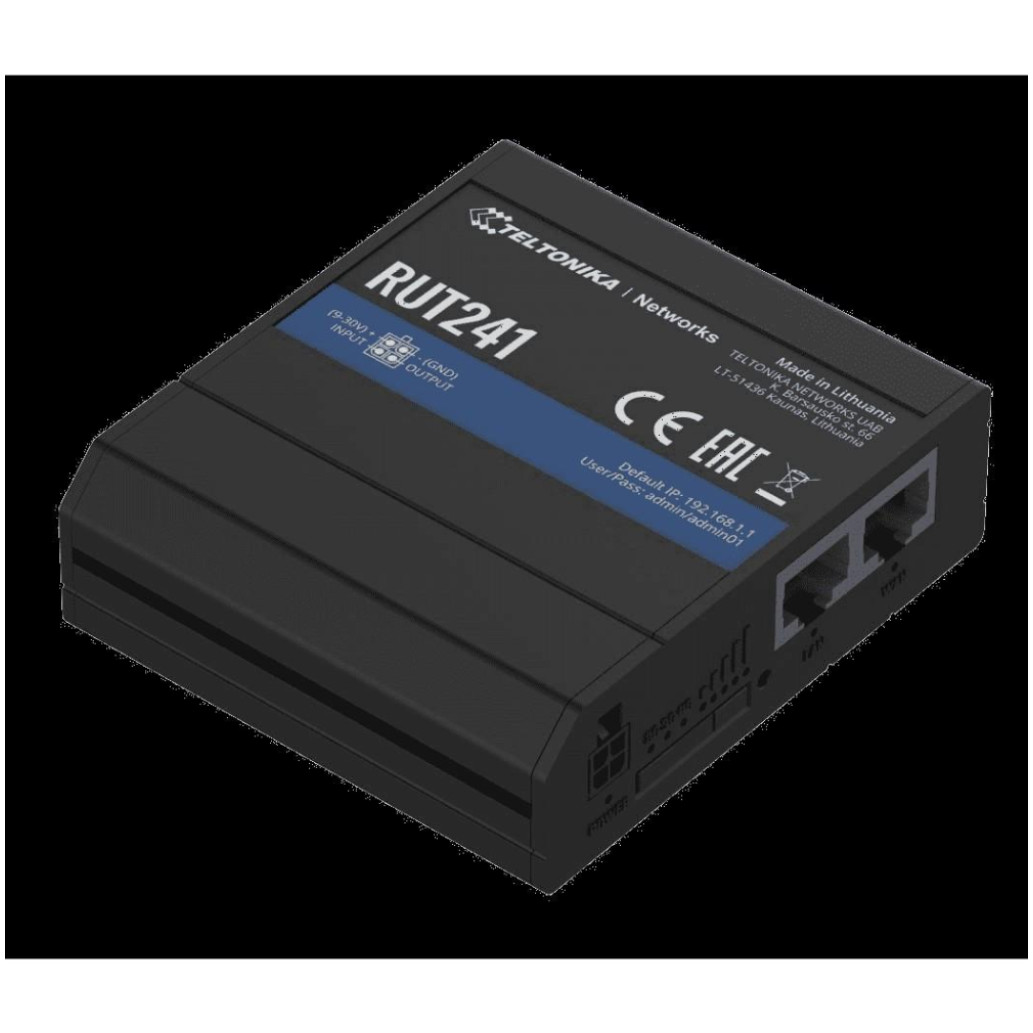 Teltonika · Usmerjevalnik · RUT241 · Kompakten usmerjevalnik 4G/LTE, , , , , usmerjevalnik Teltonika RUT241 4G/LTE , Pregled RUT241 je spremenjena različica naše prodajne uspešnice RUT240, ki jo je podedoval njegov najboljše lastnosti, vključno z industrijsko zasnovo, kompaktno velikostjo , več povezovalnimi vmesniki in združljivostjo z RMS. Ta usmerjevalnik, opremljen s 4G LTE, Wi-Fi in dvema ethernetnima priključkoma, ponuja neustavljivo neprekinjeno povezavo, podprto s samodejnim preklopom. Digitalni vhodi in izhodi v povezavi z napredno programsko opremo RutOS omogočajo scenarije avtomatizacije za rešitve. RUT241 je idealen za različne rešitve IoT in M2M.Lastnosti Povezljivost – 4G/LTE (Cat 4), 3G, 2GWAN Fallover – Samodejni preklop na razpoložljivo , Rezervna povezavaWiFi – Brezžična dostopna točka z vročo točko , Funkcionalnost, tMajhna velikost, eI/O – Digitalni vhod/izhod za daljinsko upravljanje, RMS nadzor in nadzor – združljiv s sistemom za daljinsko upravljanje RMS , obseg dobave , ,.