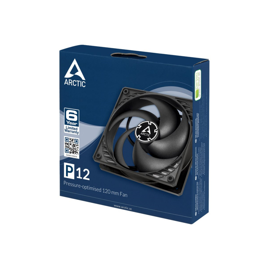 ARCTIC P12 – 120 mm ventilator, optimiziran za statični tlak. Tip: ventilator, premer ventilatorja: 12 cm, hitrost vrtenja (maks.): 1800 RPM, Raven hrupa: 0,3 sone, Največji pretok zraka: 56,3 cfm, Pretok zraka: 95,65 m³/h, Vrsta ležaja: Fluid Dynamic Bearing (FDB). Napetost: 12V. Širina: 120 mm Globina: 120 mm Višina: 25 mm. Barva izdelka: Črna.