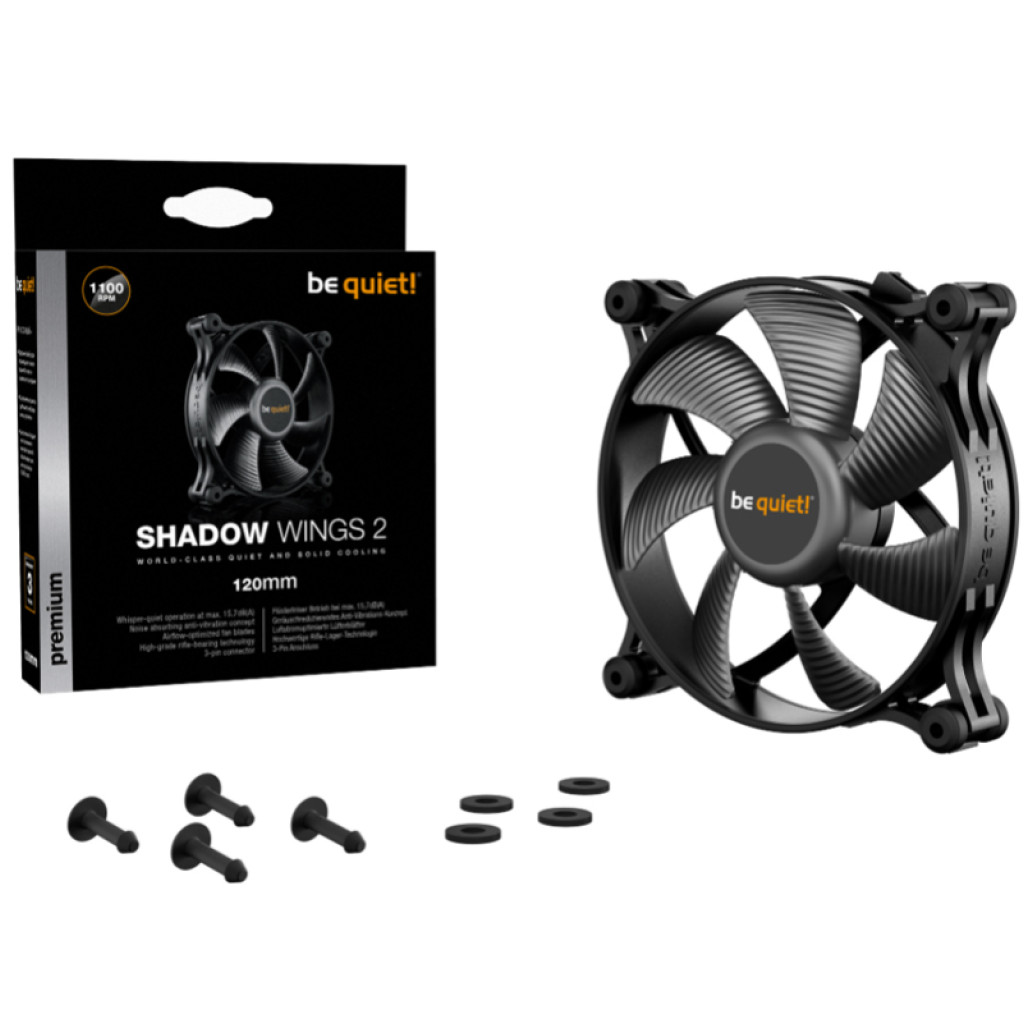 Bodi tiho! BL084. Tip: ventilator, premer ventilatorja: 12 cm, hitrost vrtenja (maks.): 1100 RPM, Raven hrupa (visoka hitrost): 15,7 dB, Največji pretok zraka: 38,5 cfm, Pretok zraka: 65 m³/h, Največji zračni tlak: 0,82 mmH2O, Vrsta ležaja: Puščni ležaj. Napetost: 6-12V. Barva izdelka: Črna.