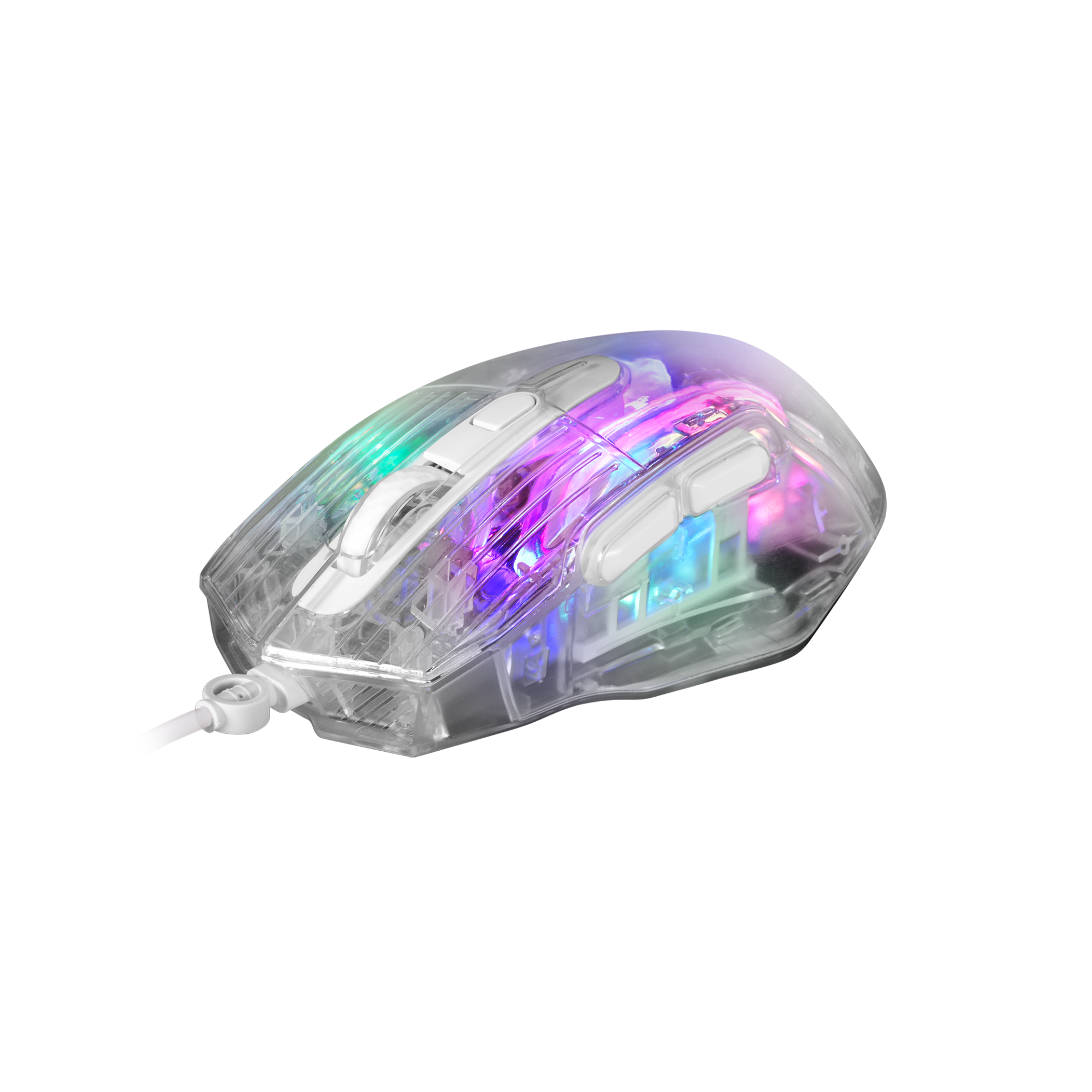 Marvo M413 Prism 40 je igralna miška z osupljivo prosojno zasnovo in RGB osvetlitvijo, ki izboljša vizualno izkušnjo med igranjem. Opremljena je s šestimi programsko nastavljivimi gumbi in spodnjim gumbom za prilagajanje osvetlitve, kar omogoča prilagoditev po meri. Natančen senzor ponuja nastavljivo ločljivost od 1200 do 7200 DPI, kar zagotavlja optimalno odzivnost in nadzor v vsaki situaciji. Povratna hitrost znaša 125 Hz, levi in desni gumb pa imata življenjsko dobo do 3 milijone klikov, kar zagotavlja dolgotrajno vzdržljivost in zanesljivost.