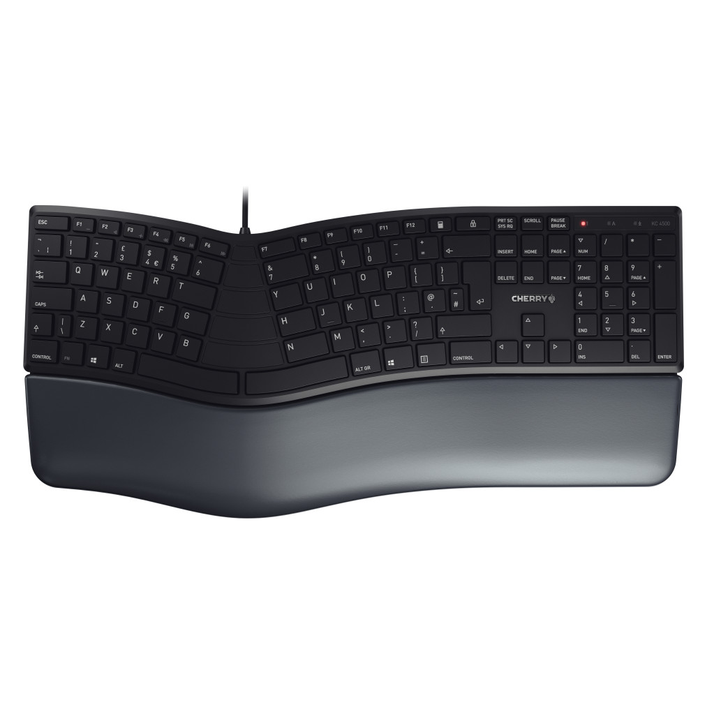 Ergonomska tipkovnica, kot je CHERRY KC 4500 ERGO, lahko zagotovi preprosto olajšanje. Zaradi posebne zasnove vaše roke in roke same zasedejo bolj naraven položaj na tej kabelski tipkovnici. Vaša ramena in hrbet se razbremenijo zaradi sproščene drže. Stres se zmanjša. Izjemno mehak naslon za dlani s spominsko peno preprečuje točke pritiska. Vaše roke udobno počivajo na tipkovnici.