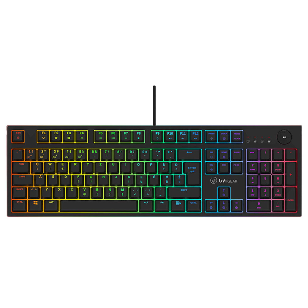 UVI PRIDE V2 je optična+mehanska gaming tipkovnica z modrimi stikali in slovensko postavitvijo (UK, SLO/CRO postavitev tipk). UVI Pride V2 uporablja najnovejšo tehnologijo stikal z infrardečim senzorjem. Odzivni čas OPTIČNIH+MEHANSKIH modrih stikal je samo 0,2 ms. To je 30% hitreje od običajnih mehanskih stikal, kar ustvari superiorno gaming izkušnjo! Izbiraj med 19 različnimi RGB efekti osvetlitve in 16,8 milijona različnih barv. Prilagodi intenzivnost in hitrost osvetlitve ter si ustvari idealno RGB osvetlitev v aplikaciji UVI One. Enostaven nadzor zvočnih nastavitev z namensko medijsko tipko – za nadzor glasnosti in predvajanje ter premor. Za lažjo dostopnost se nahaja na desni strani tipkovnice. Ob nakupu tipkovnice UVI Pride V2 prejmeš tudi podporo za zapestja, ki poskrbi za dodatno udobje med celodnevnimi gaming seansami ali urami tipkanja! UVI Pride V2 je združljiva z Windows in macOS operacijskima sistemoma ter PlayStation 4 in 5 kot tudi XBOX konzolami. UVI Pride V2 ima prilagodljivi nogici, ki omogočata tri različne naklone tipkovnice. Na spodnjem delu kanal, ki omogoča elegantno ureditev kabla po sredini, levi ali desni strani.