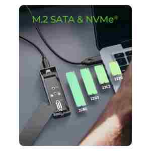 Ohišje podpira širok nabor M.2 formatov od 2230 do 2280 in je opremljeno z M-Key vtičnico, ki omogoča uporabo tako NVMe kot SATA SSD-jev. Povezava prek USB-C 3.2 Gen 2 zagotavlja hitrosti do 10 Gbit/s, priloženi 60 cm kombinirani USB-C/USB-A kabel pa omogoča uporabo z različnimi napravami. Za stabilno delovanje je vključen termalni pad, ki učinkovito odvaja toploto iz SSD-ja na ohišje. Podpora za HotSwap omogoča hitro menjavo SSD-jev brez izklopa sistema, kar je idealno za nadgradnje, varnostne kopije ali delo z več diski. Ohišje je združljivo z Windows, macOS in Linux, zato ga je mogoče vključiti v različna okolja brez dodatnih gonilnikov.