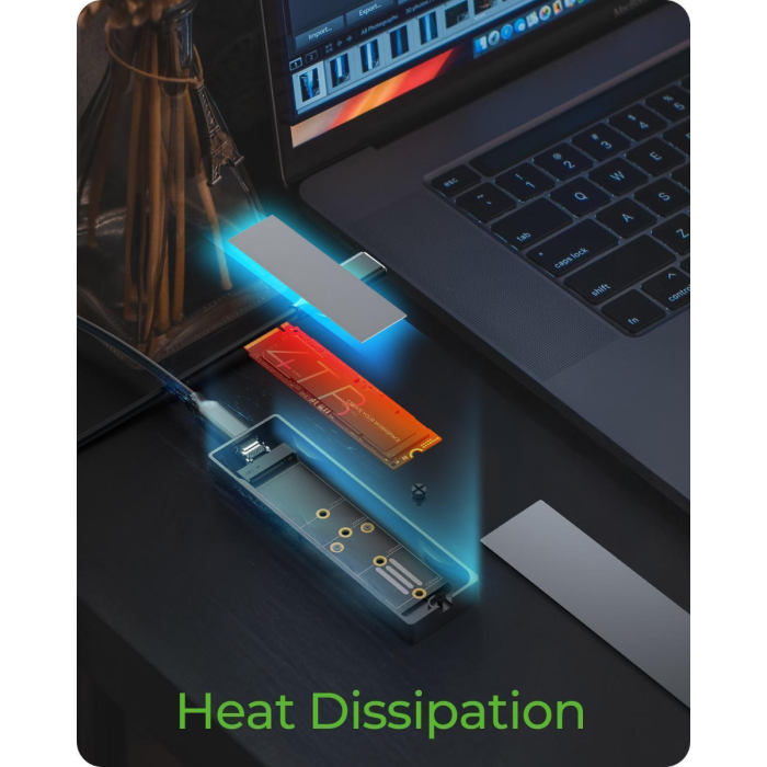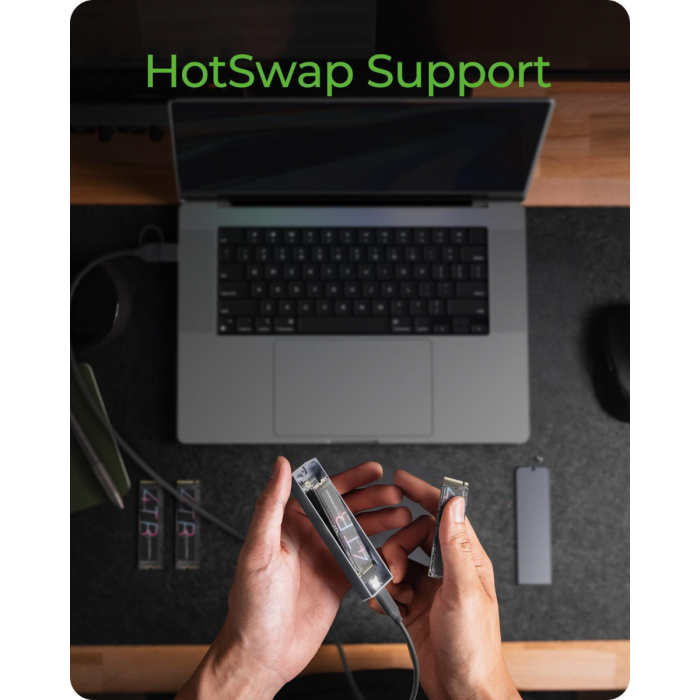 Ohišje podpira širok nabor M.2 formatov od 2230 do 2280 in je opremljeno z M-Key vtičnico, ki omogoča uporabo tako NVMe kot SATA SSD-jev. Povezava prek USB-C 3.2 Gen 2 zagotavlja hitrosti do 10 Gbit/s, priloženi 60 cm kombinirani USB-C/USB-A kabel pa omogoča uporabo z različnimi napravami. Za stabilno delovanje je vključen termalni pad, ki učinkovito odvaja toploto iz SSD-ja na ohišje. Podpora za HotSwap omogoča hitro menjavo SSD-jev brez izklopa sistema, kar je idealno za nadgradnje, varnostne kopije ali delo z več diski. Ohišje je združljivo z Windows, macOS in Linux, zato ga je mogoče vključiti v različna okolja brez dodatnih gonilnikov.